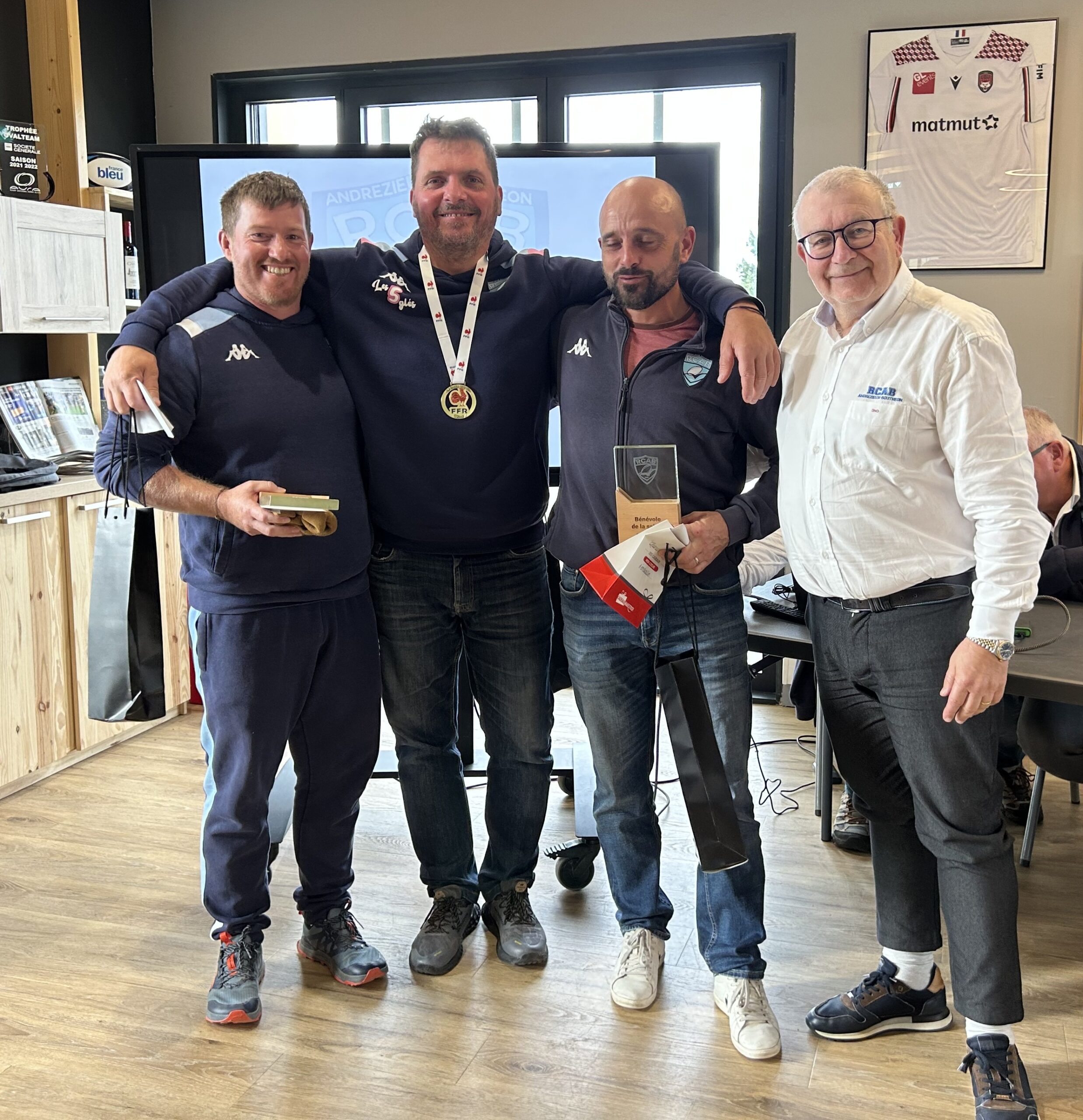 Il est de coutume lors de l’Assemblée Générale du RCAB de récompenser des personnes qui ont oeuvré à divers titres et dans leurs domaines de compétence au bon fonctionnement du club. Le président Eric Trouillet n’a pas failli à cette tradition lors de cette réunion annuelle en mettant à l’honneur Laurent Boigne, un des coaches qui a permis au RCAB d’évoluer. « Lolo » a été un entraineur apprécié au sein du groupe senior et pas mal de jeunes lui doivent d’avoir progressé et franchi un cap. Compétent, exigeant, il a servi la cause du club avec beaucoup d’enthousiasme et d’implication avant d’aspirer à un break bien mérité après plusieurs saisons prenantes et couronnées de succès.