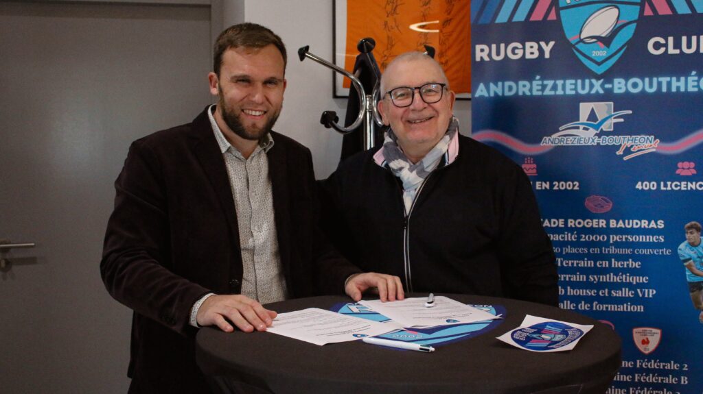 Valentin Tricot, représentant des Compagnons du Devoir et Eric Trouillet, le président du RCAB ont signé la convention dans la bonne humeur. (photo Léana Verrière)