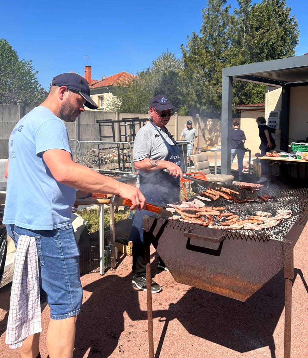 Photos de gauche à droite: Mireille et Sandrine, Eric et Patrick, les rois du barbecue, Emmanuel et Philippe les cuistots, Léana et Charline les photographes, Nathalie, Patrick, Irène et Philippe à la buvette et Damien et Loïc, les serveurs de pâtes-poulet aux seniors.